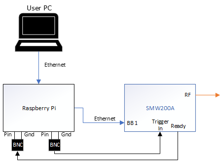 Additionally, note that Pin 7 and Pin 11 of the 40-pin header on the Pi must be connected to two separate BNC connectors. These connectors are used to accept the SMW200A ready signal, and to drive the SMW200A trigger signal. The connector attached to Pin 7 must be connected to the SMW200A User 3 BNC interface. The connector attached to Pin 11 must be connected to the SMW200A User 1 BNC interface.