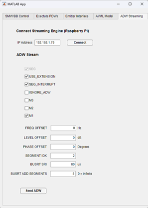 The user interface (UI) on the external control PC runs from a custom-designed MATLAB application. The application is made simple to send TCP/IP ethernet packets containing new ADW information to the Raspberry Pi controller. Figure 9 displays the UI where the user can specify the new ADW information to send to the controller.