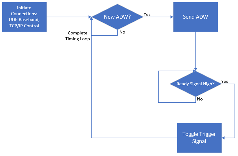 The Raspberry Pi hosts a C program which utilizes a configurable timing loop to send updated ADWs to the SMW200A baseband. The software consists of a simple cyclic task which looks for new ADWs provided by the User PC. Once a new ADW is present at the controller’s input, it sends the ADW and waits for the SMW200A to supply an active Ready signal. Once the controller reads an active Ready signal, it toggles an active high signal on its trigger pin to initiate the arbitrary waveform file specified by the ADW.