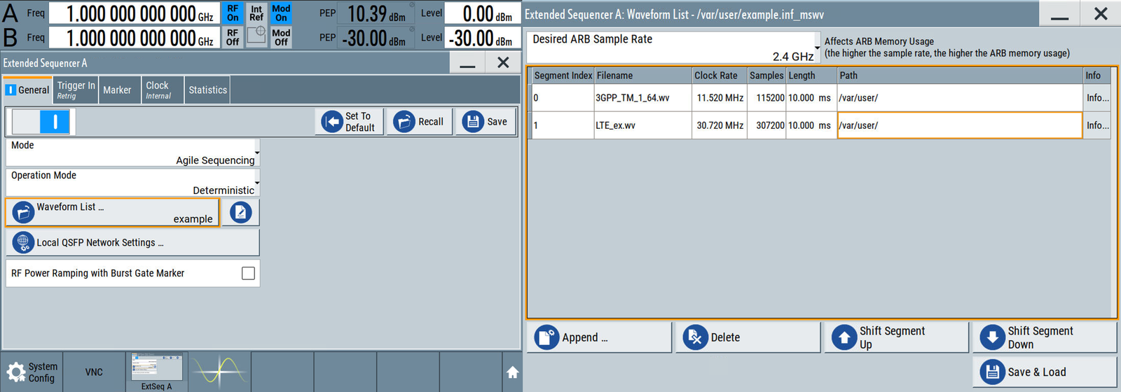 Additionally, within this window the user can specify the desired arbitrary waveform sampling rate. The sample rate needs to be consistent across all waveforms within the list. Therefore, every waveform must be resampled to the same sample rate with the dedicated sample rate selected by the user. The SMW200A will perform the resampling for the user. Higher sample rates provide access to wider bandwidth signals, with the tradeoff of high memory usage. It is important to note that the maximum memory usage (at the time of this writing) is 2GSamples of ARB memory depth. Once the Save & Load button has been selected, the SMW200A will resample the input waveforms as needed, and will load them into the arbitrary waveform generator.